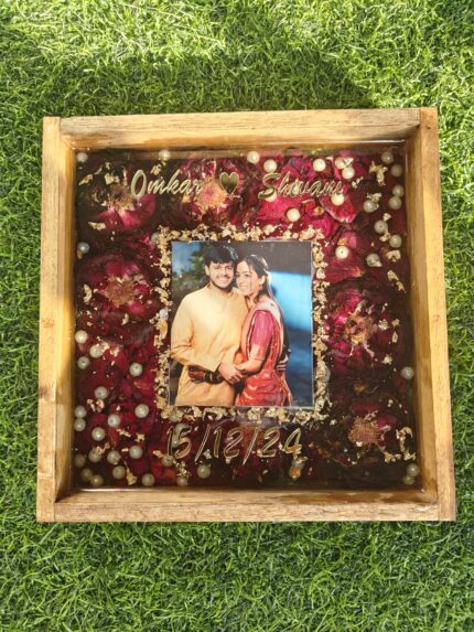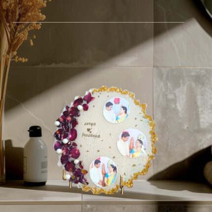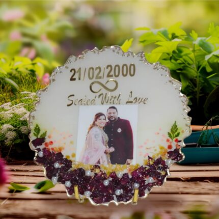 Saashi’s Handmade Resin Photo Frame with Ring Platter elegantly displays cherished memories. Crafted with care, it combines functionality with beauty, making it perfect for weddings or special occasions. Capture love and memories in a unique and stylish way.