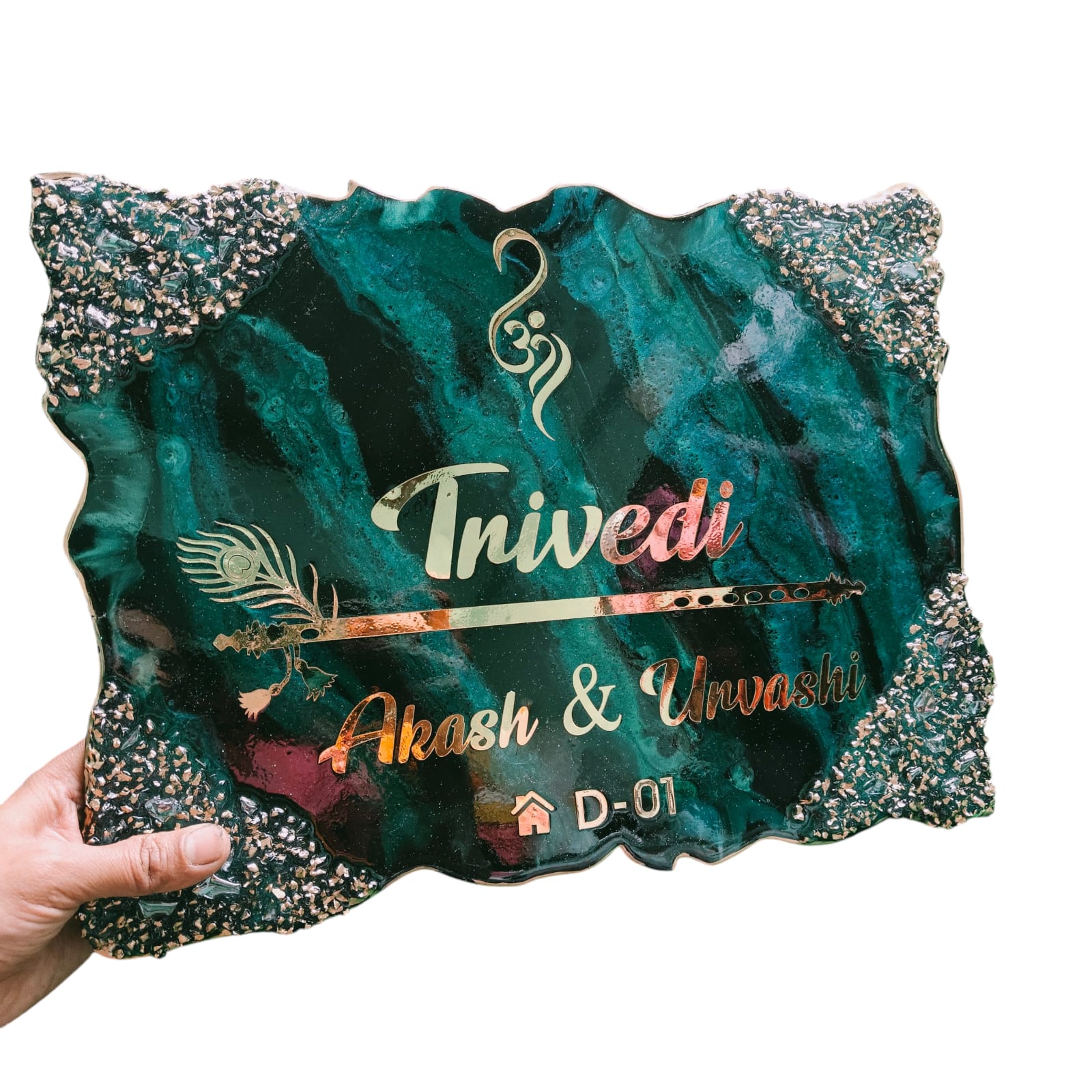 Make your home entrance unforgettable with this luxurious handcrafted resin nameplate. Designed in a deep emerald and teal marble finish, this statement piece is enhanced with rich gold crushed stone textures along the edges for a bold, premium look.