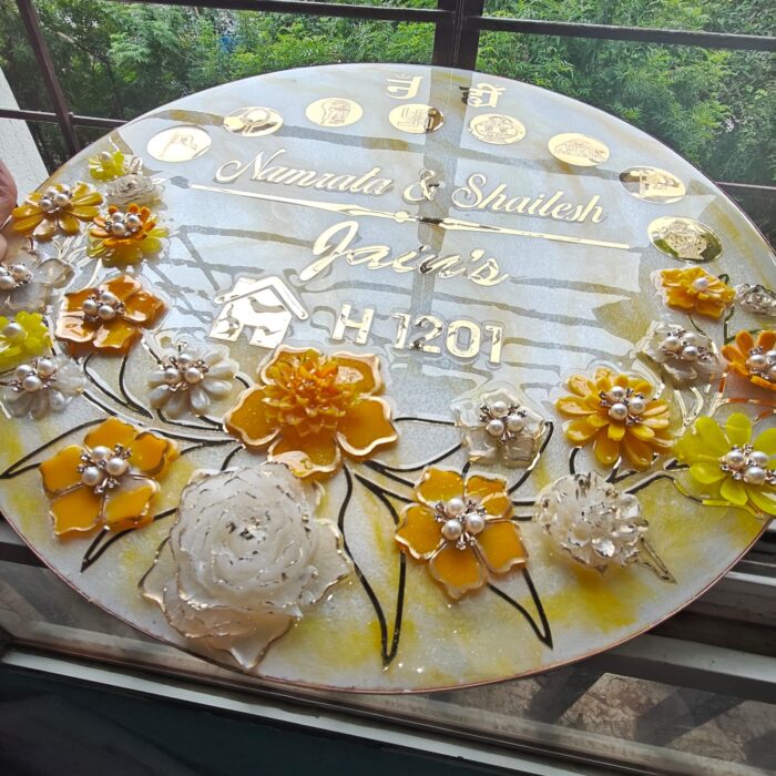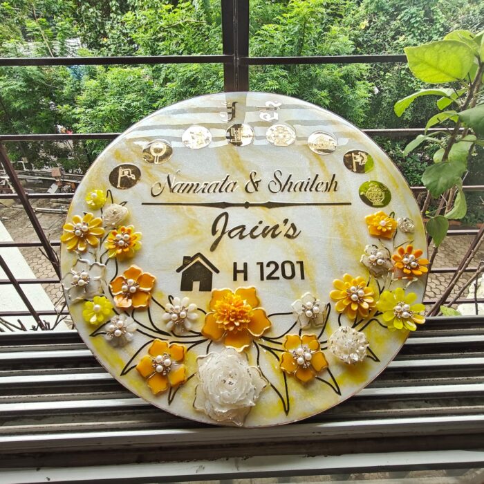 Vastu-Approved Yellow Resin Nameplate with Floral Design | Positive Energy Door Sign
